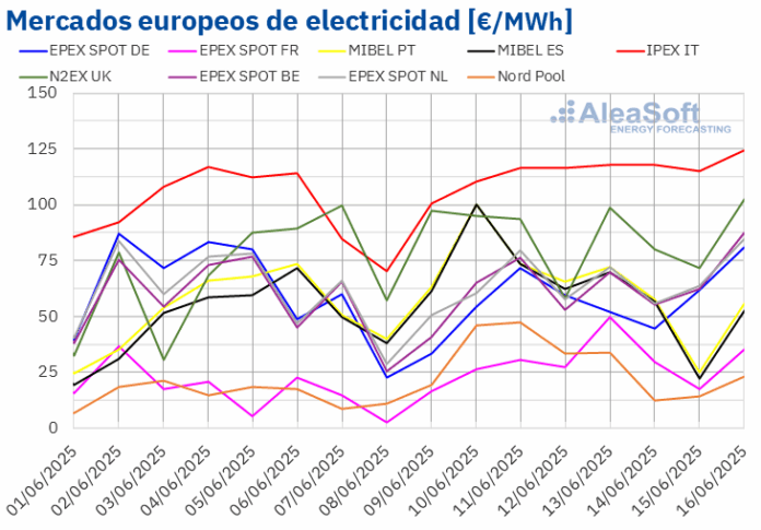 En la segunda semana de junio, los precios promedio de la mayoría de los principales mercados eléctricos europeos subieron respecto a la semana anterior. Las excepciones fueron los mercados neerlandés y alemán, con caídas del 0,3% y el 17%, respectivamente. En cambio, el mercado EPEX SPOT de Francia y el mercado Nord Pool de los países nórdicos alcanzaron las mayores subidas porcentuales de precios, del 65% y el 88%, respectivamente. En el resto de los mercados analizados en AleaSoft Energy Forecasting, los precios subieron entre el 1,7% del mercado EPEX SPOT de Bélgica y el 24% del mercado MIBEL de España.