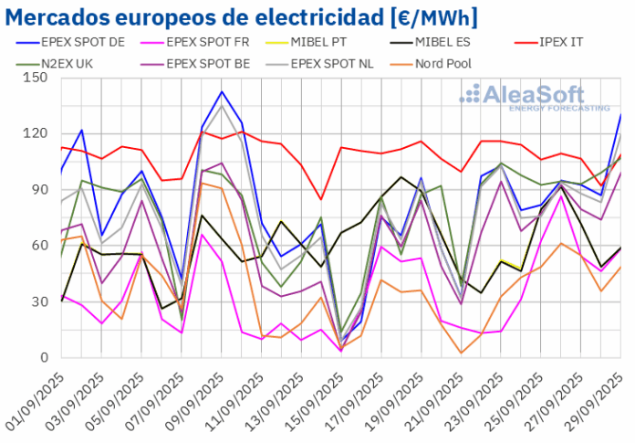 Por otra parte, el mercado italiano continuó registrando precios diarios superiores a 100 €/MWh durante casi toda la cuarta semana de septiembre. El día 23 de septiembre este mercado alcanzó el promedio diario más elevado de la semana, de 116,20 €/MWh. Ese día, los mercados alemán, británico y neerlandés también alcanzaron precios diarios por encima de 100 €/MWh. Por otra parte, el lunes 29 de septiembre, los precios diarios de estos cuatro mercados eléctricos fueron superiores a 100 €/MWh otra vez. Ese día, el mercado alemán registró el mayor precio diario, de 130,57 €/MWh.