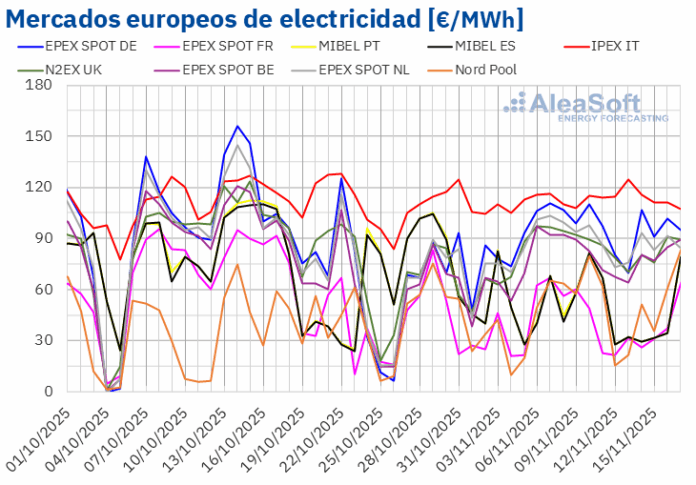 En la semana del 10 de noviembre, los promedios semanales fueron inferiores a 85 €/MWh en la mayoría de los mercados eléctricos europeos. Las excepciones fueron los mercados neerlandés, alemán e italiano, cuyos promedios fueron de 85,74 €/MWh, 93,69 €/MWh y 115,19 €/MWh, respectivamente. El mercado francés alcanzó el menor promedio semanal, de 31,28 €/MWh. En el resto de los mercados analizados en AleaSoft Energy Forecasting, los precios estuvieron entre los 43,32 €/MWh del mercado ibérico y los 81,54 €/MWh del mercado N2EX del Reino Unido.