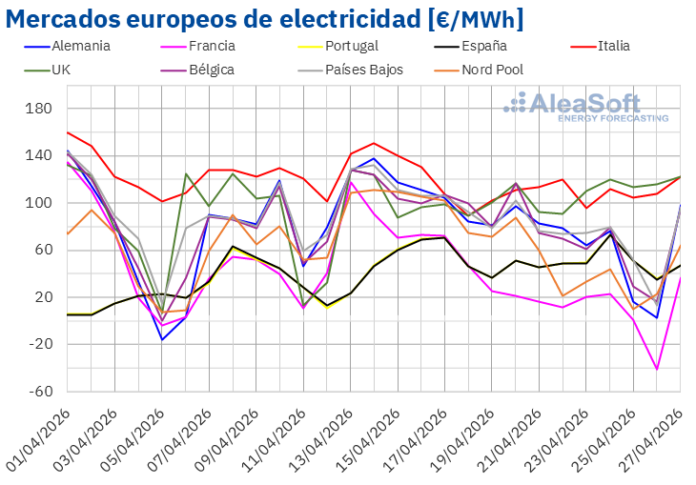 En la cuarta semana de abril, los precios de la mayoría de los principales mercados eléctricos europeos descendieron respecto a la semana anterior, favorecidos por la caída de la demanda y el incremento de la producción eólica y solar. La generación solar fotovoltaica alcanzó récords para un día de abril e incluso máximos históricos en mercados como el italiano, mientras los futuros de gas TTF y de petróleo Brent repuntaron por el aumento de la tensión geopolítica en Oriente Medio