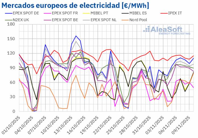 En la semana del 3 de noviembre, los promedios semanales fueron superiores a 75 €/MWh en la mayoría de los mercados eléctricos europeos. Las excepciones fueron los mercados nórdico, francés, español y portugués, cuyos promedios fueron de 43,91 €/MWh, 47,71 €/MWh, 52,50 €/MWh y 53,21 €/MWh, respectivamente. El mercado italiano alcanzó el mayor promedio semanal, de 110,99 €/MWh. En el resto de los mercados analizados en AleaSoft Energy Forecasting, los precios estuvieron entre los 79,81 €/MWh del mercado belga y los 95,39 €/MWh del mercado alemán.